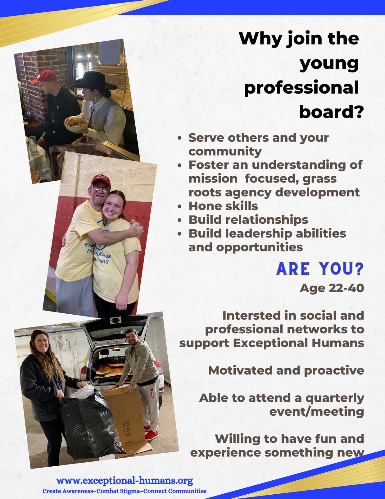 Experience the joy of service to Exceptional Humans while expanding your professional network, meeting new friends, and having fun!